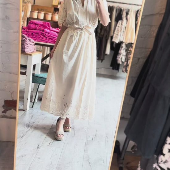 Embroidered Eyelet Belted Mid Dress in Champaign Ivory