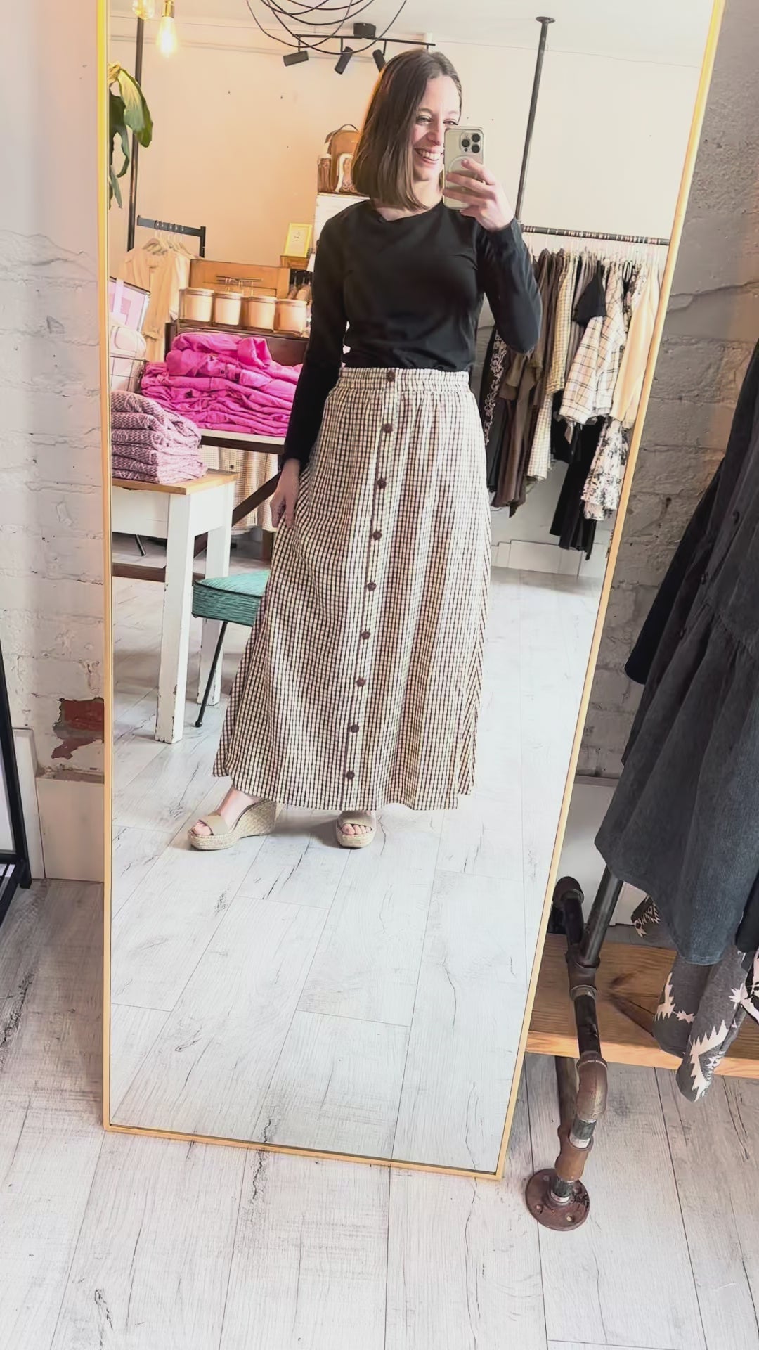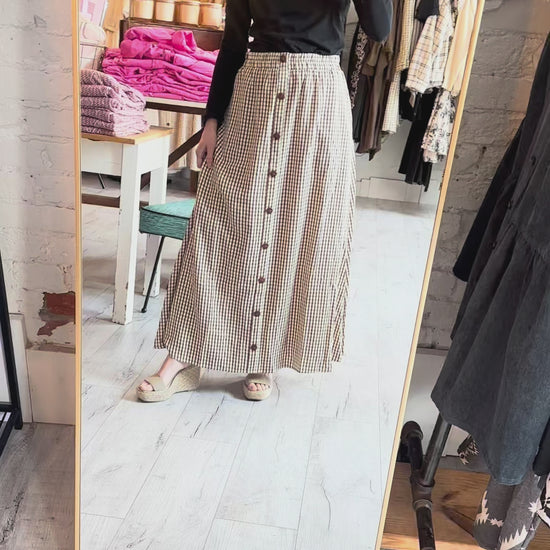The McKenna Gingham Maxi Skirt brings all the sweet details in a timeless, modest silhouette. Featuring a soft crinkle cotton texture, daisy-cut button accents, and an easy elastic waistband, this fully lined skirt blends comfort and style with ease. The warm neutral gingham pattern adds a nostalgic touch that feels fresh and effortlessly feminine for everyday wear.